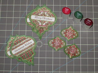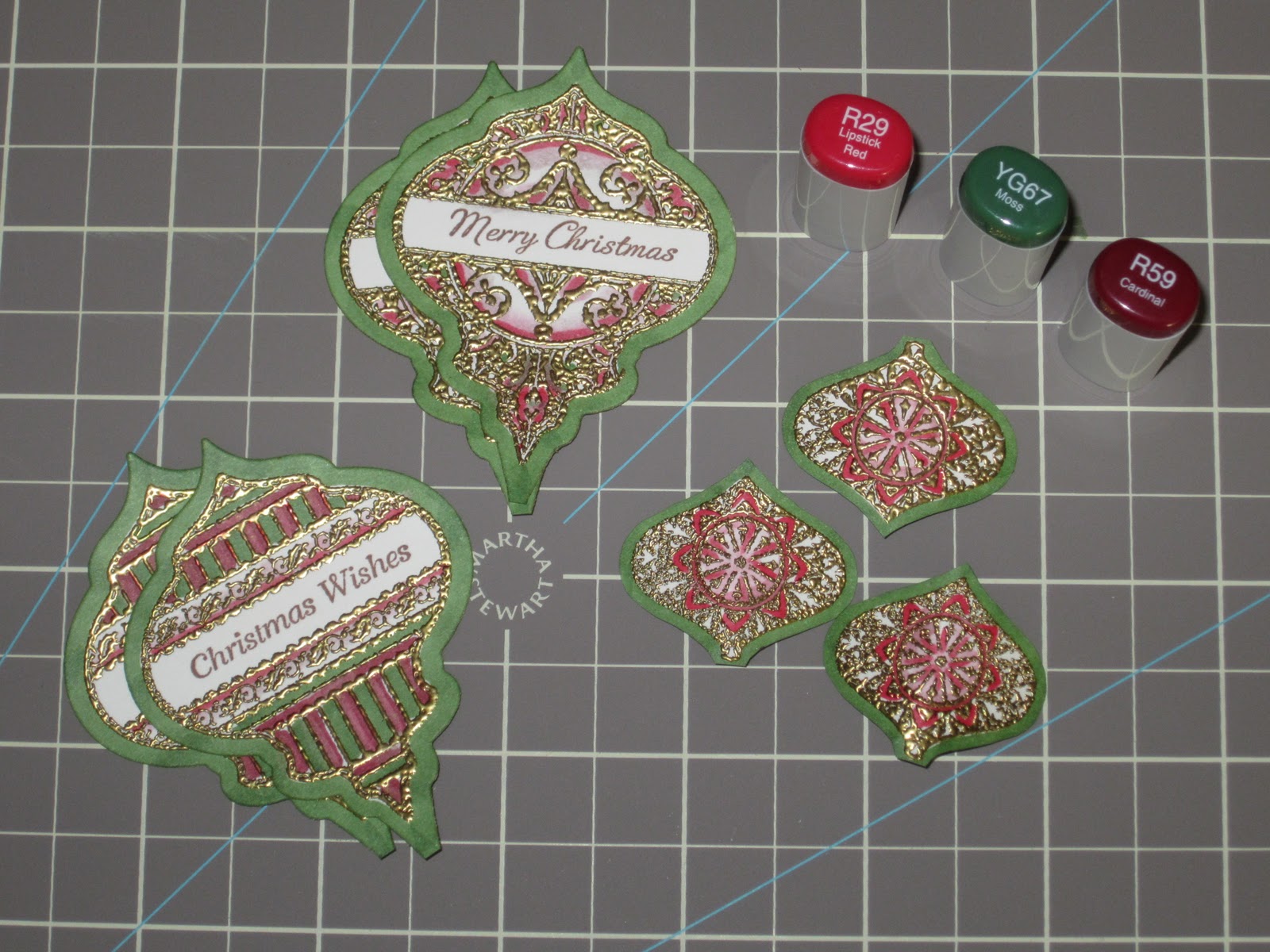 For the box, I rubber stamped and die cut 12 of the large ornament and 6 of the small ornament. Notice that I also glued the ornaments to the inside of the box. I used gold embossing powder to stamp the ornaments and I colored them with Copic markers.