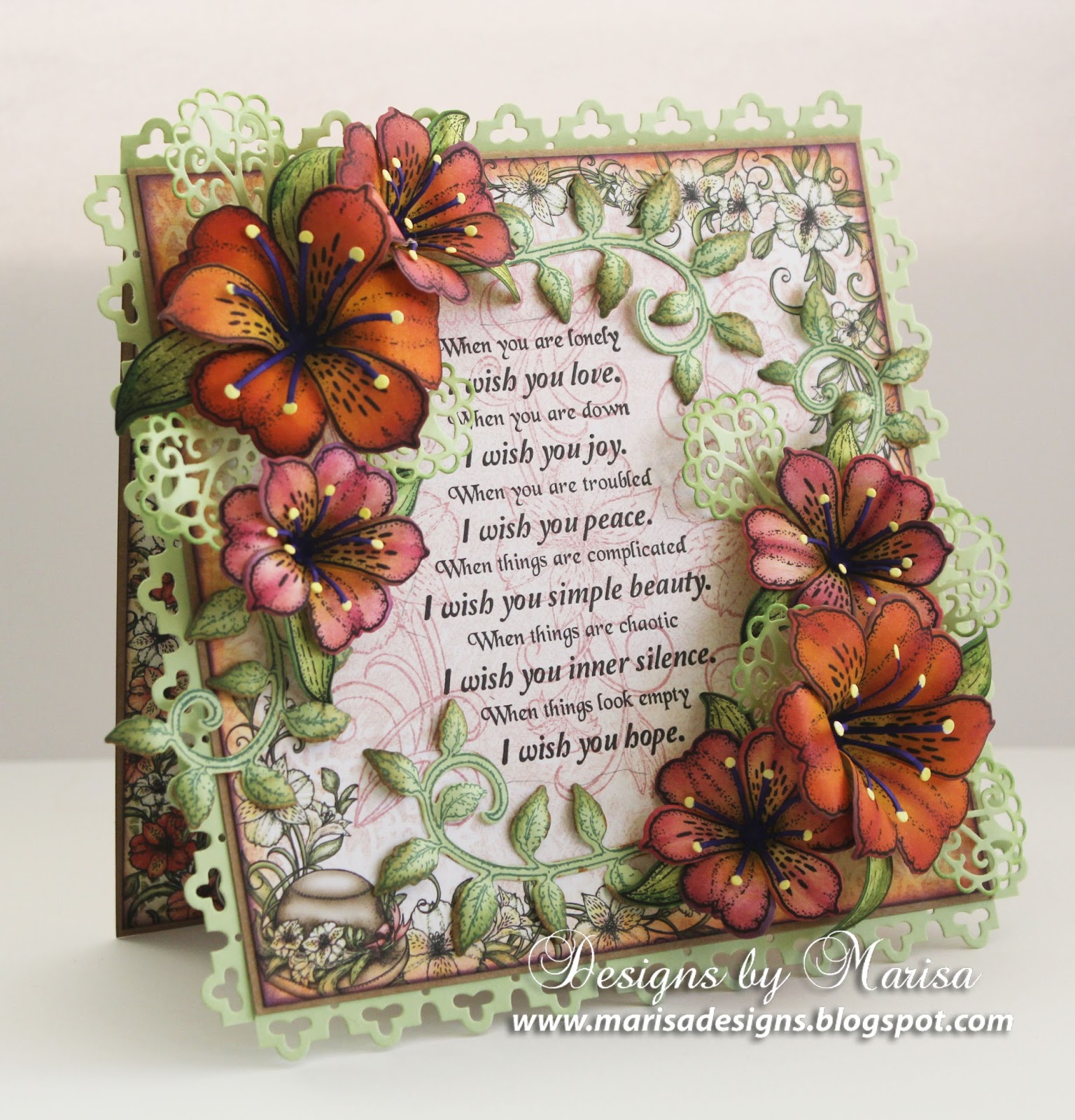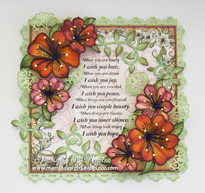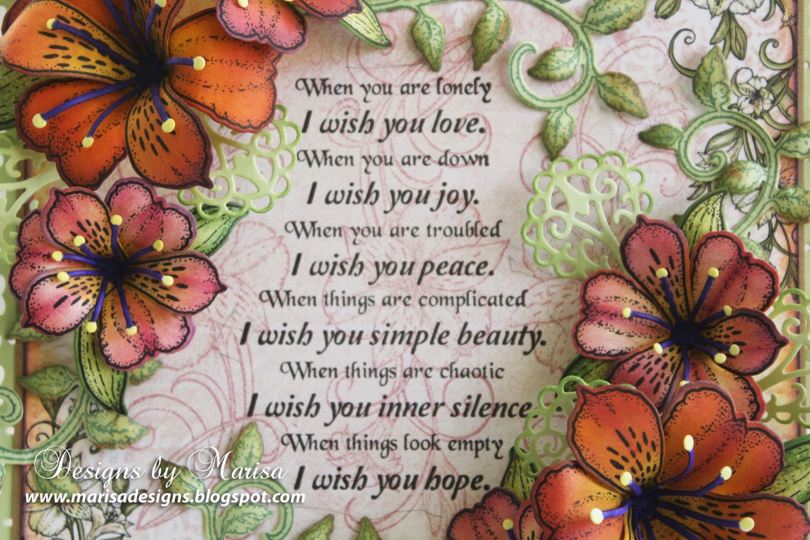 The flowers were die cut with Floral Trio Two Dies, and the vines and ovals for sentiment were die cut with Stitched Oval and Vines Dies. The sentiment from Chrysanthemums Clear Stamps was stamped with black ink onto oval piece and then adhered to card with foam squares. The flowers and vines were colored with water colors and then hot glued to card. I embellished the center of flowers with micro-beads.