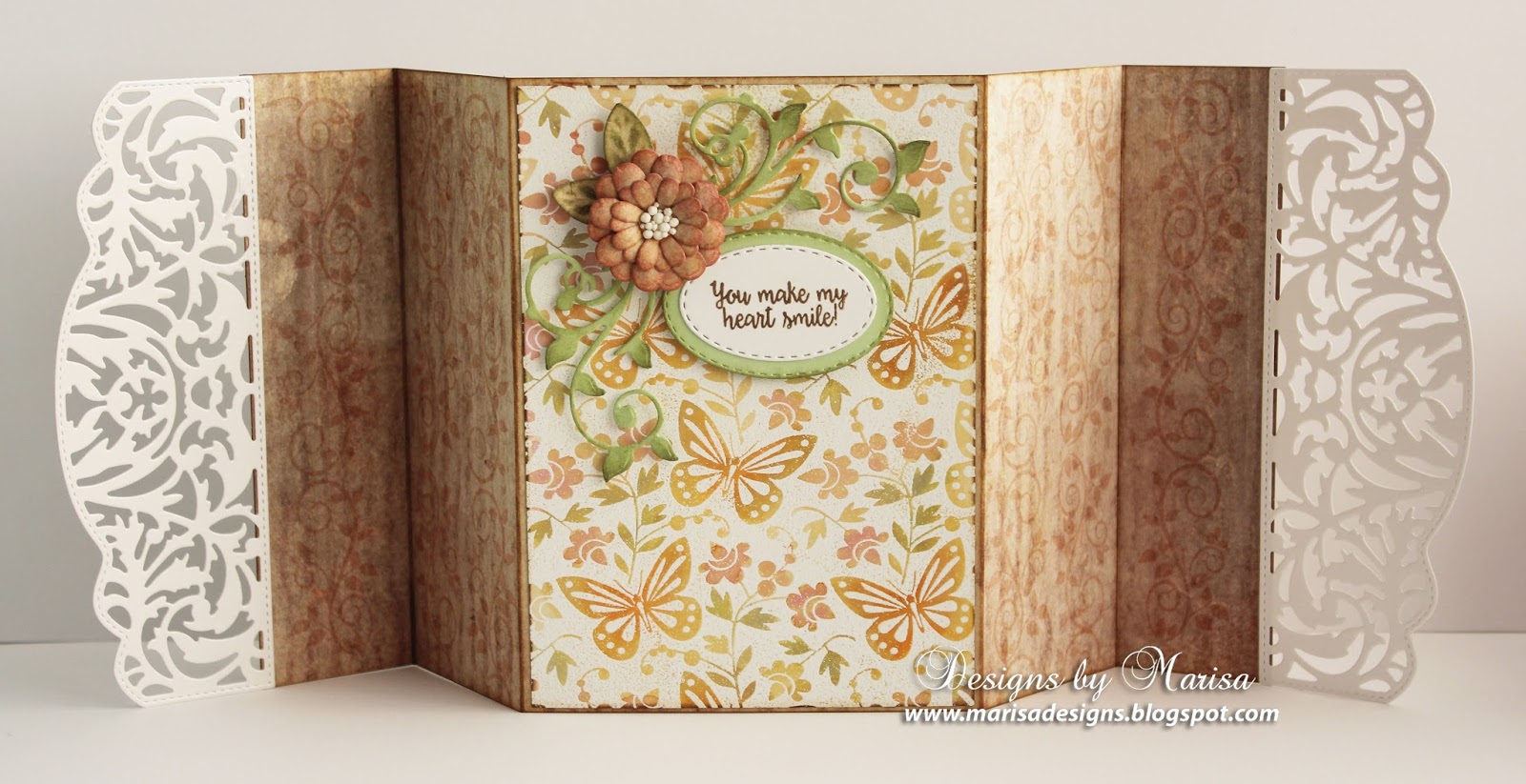 I cut the top layer to 5 1/2" x 4 1/5" using water color paper. I stamped Floral Silhouettes One Clear Stamps using Versamark and Nuvo Glacier White embossing powder and then heat set. I used Color Burst water colors to color the background and then adhered to card with foam tape.