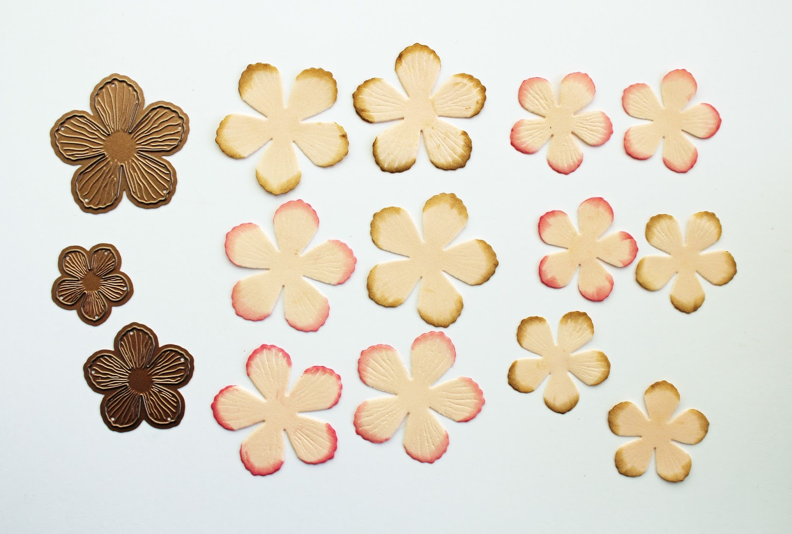 5. Die cut multiple flowers and leaves with Textured Flowers S5-317 die set from Foamiran in peach color. Color edges of all